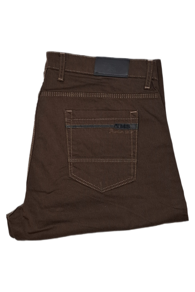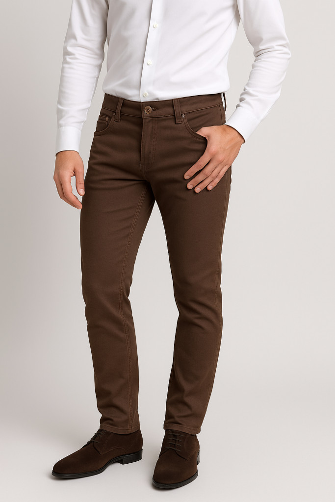 A barna szín természetes, férfias árnyalat, amely bármilyen alkalomhoz illik, legyen szó irodai megjelenésről vagy hétvégi programokról. Az egyenes szárú fazon (regular fit) klasszikus szabása kényelmes és időtálló, tökéletesen illeszkedik a test vonalához anélkül, hogy szűk vagy bő lenne.