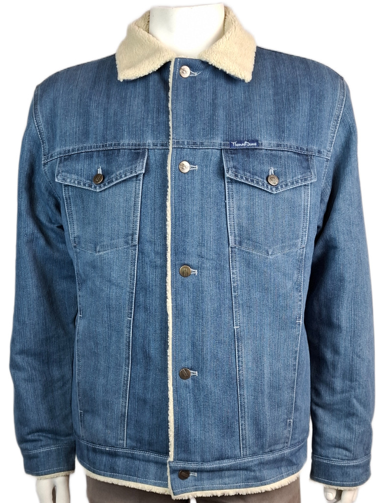 A világoskék farmer szín időtálló és könnyen kombinálható más ruhadarabokkal, legyen szó hétköznapi vagy lezserebb öltözetről. A műszőrme hatású gallér extra meleget és stílust ad a kabátnak, míg a Thomas Jeans logóval díszített gombok és a mellzsebek a klasszikus farmerdzseki részleteit idézik.