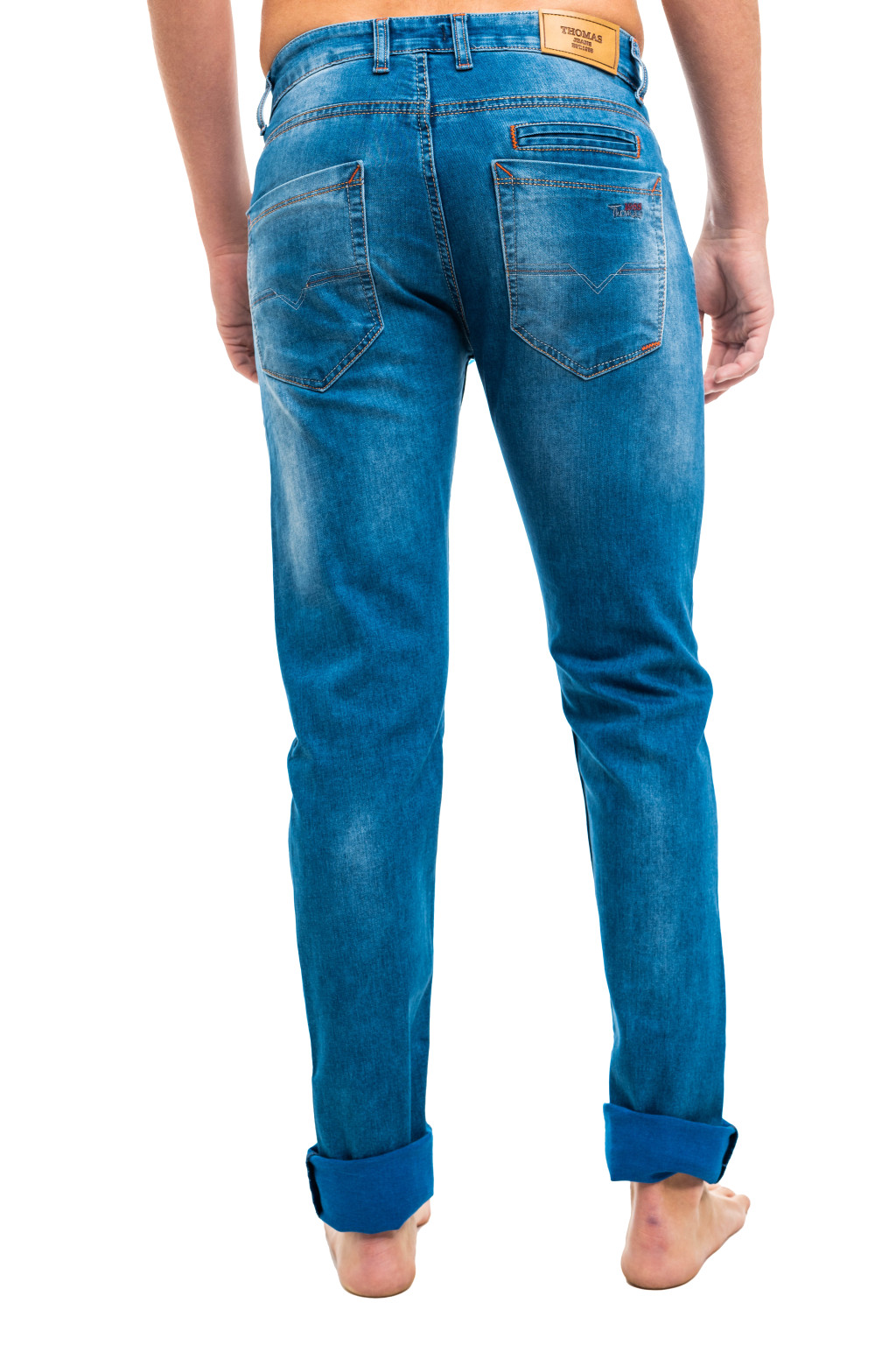A márványos koptatású középkék árnyalat különleges textúrát ad a nadrágnak, amely trendi, mégis időtálló megjelenést kölcsönöz. Az egyenes szárú fazon és a kontrasztos varrások kiemelik a nadrág vonalvezetését, míg a hátsó zsebek díszítése és Thomas Jeans logóhímzése prémium részletként jelenik meg.