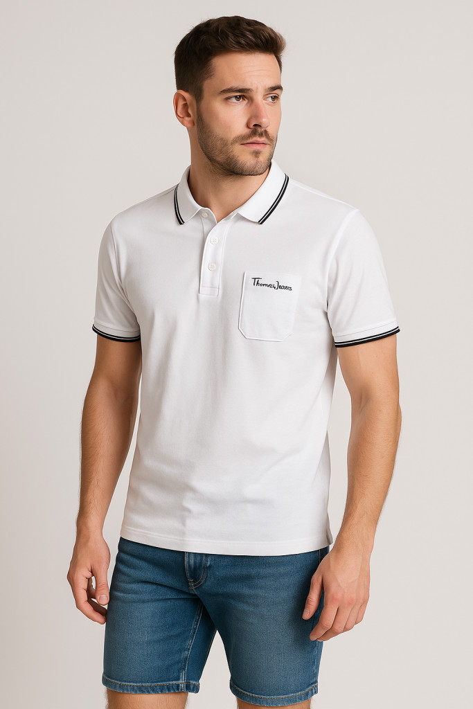 A póló klasszikus gallérral és rövid ujjakkal rendelkezik, a gallér és az ujjszegély pedig fekete-fehér csíkozású díszítést kapott, ami sportos, mégis kifinomult megjelenést ad. A mellrészen található Thomas Jeans logóval hímzett zseb pedig prémium részlet, amely kiemeli a márka egyedi stílusát.