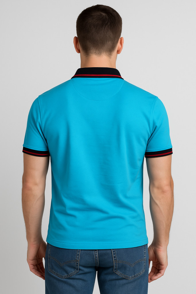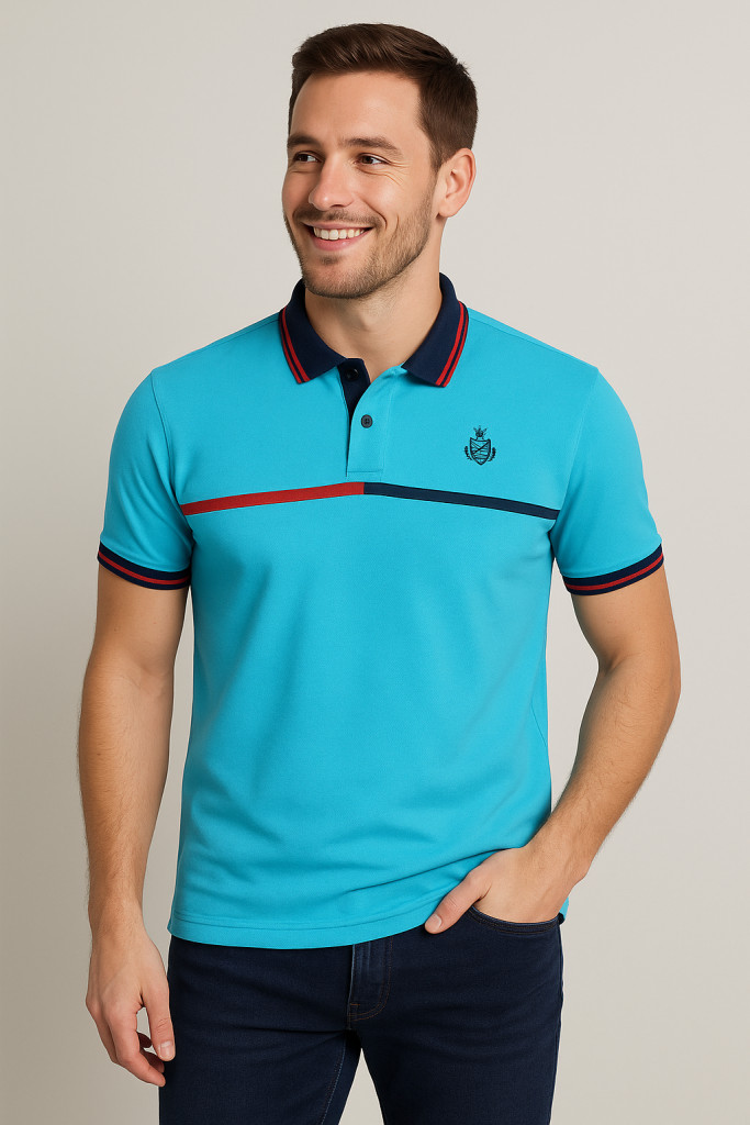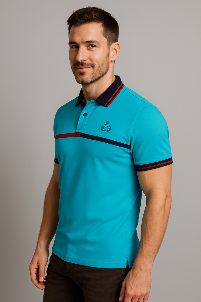 A türkizkék alapszín friss, nyári hangulatot áraszt, amelyet a mellrészen futó piros és sötétkék vékony díszcsík tesz még karakteresebbé. A sötétkék gallér piros szegéllyel és az azonos színű ujjszegélyek elegáns kontrasztot alkotnak, kiemelve a prémium kidolgozást.