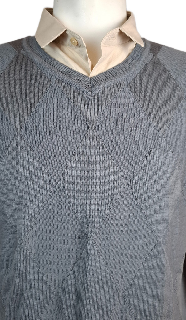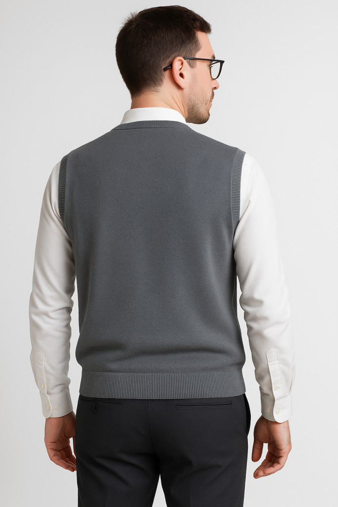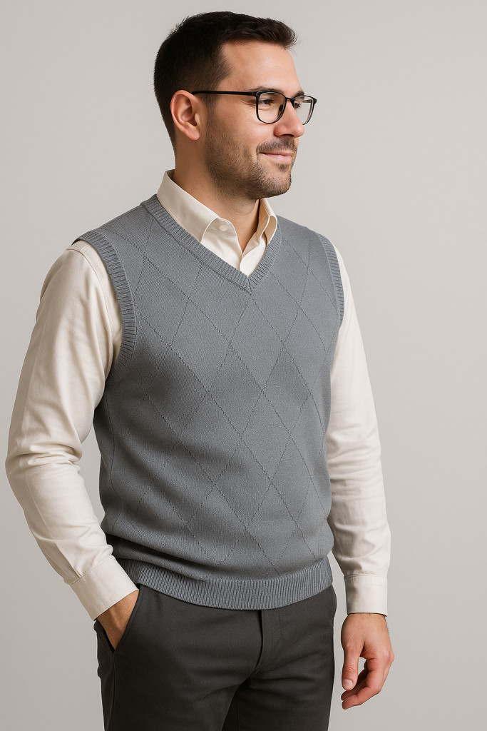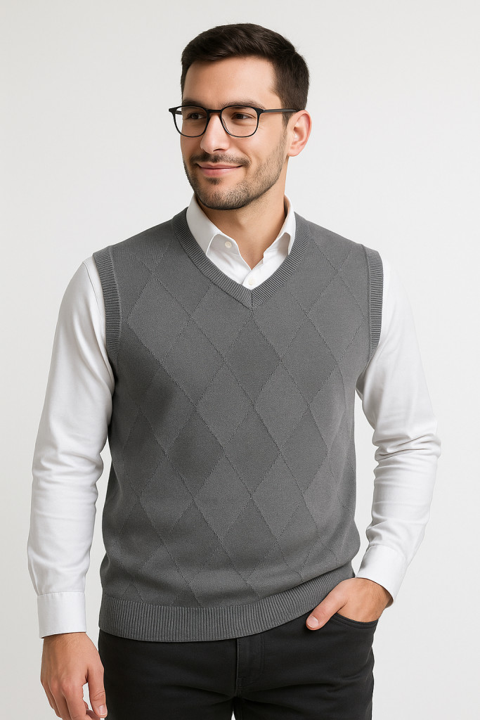 Emeld megjelenésed szintjét ezzel a szürke kötött férfi mellénnyel, amely klasszikus rombusz mintás kötési technikával készült, így elegáns, mégis modern összhatást biztosít. 50% pamut és 50% akril keveréke gondoskodik róla, hogy puha, tartós és kényelmes legyen egész napos viselet során. A V-nyakú szabás tökéletesen mutat ing felett, akár hétköznapi, akár alkalmi összeállításhoz.