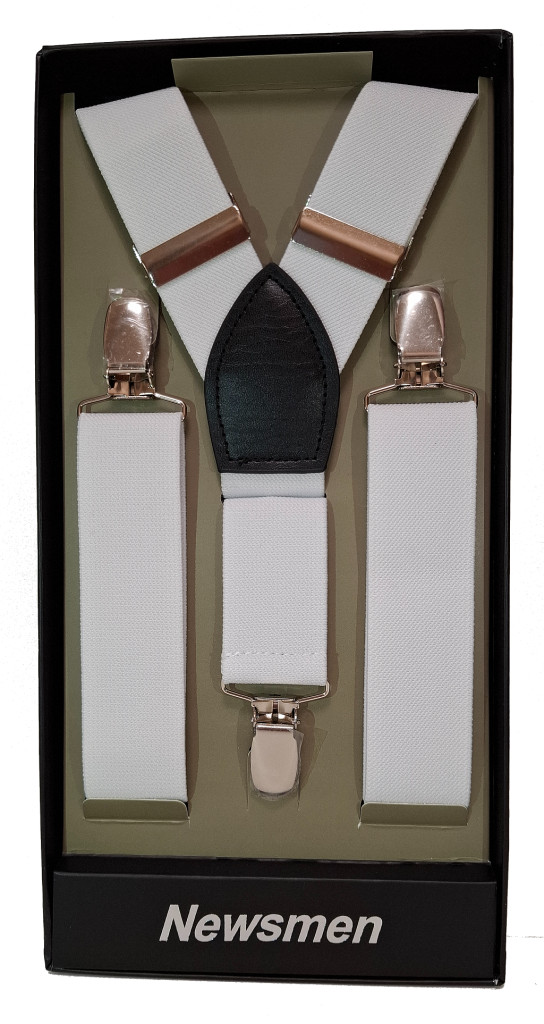 A Newsmen fehér nadrágtartó ideális választás esküvőkre, ünnepi alkalmakra vagy elegáns irodai viselethez, ahol a megjelenés és a részletek is számítanak.