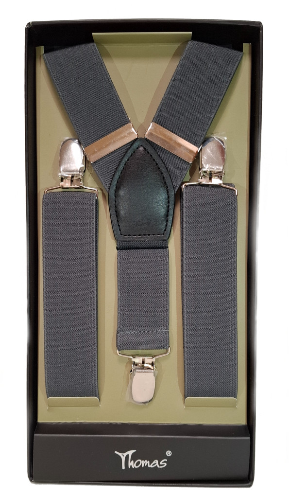 A Thomas szürke Y-alakú nadrágtartó a klasszikus elegancia és a modern funkcionalitás tökéletes egyensúlyát nyújtja. A 3 cm széles, rugalmas pántok 80–100 cm-ig nyúlnak, így biztosítva a kényelmes illeszkedést minden testalkat esetén.