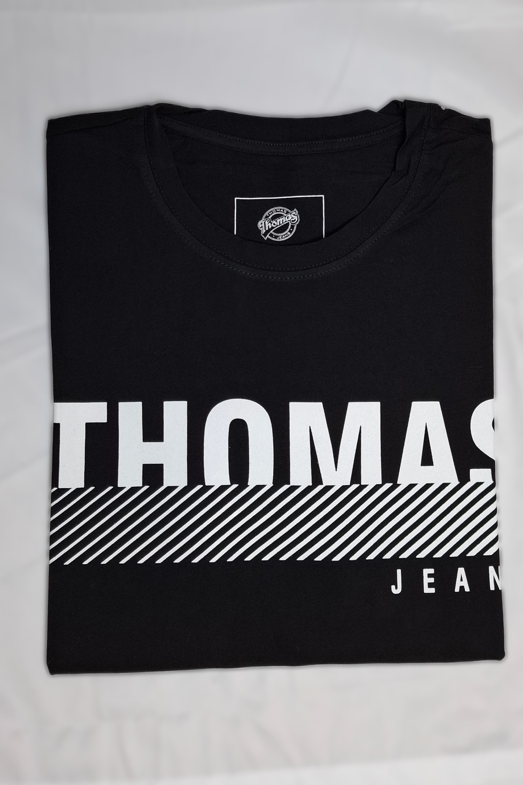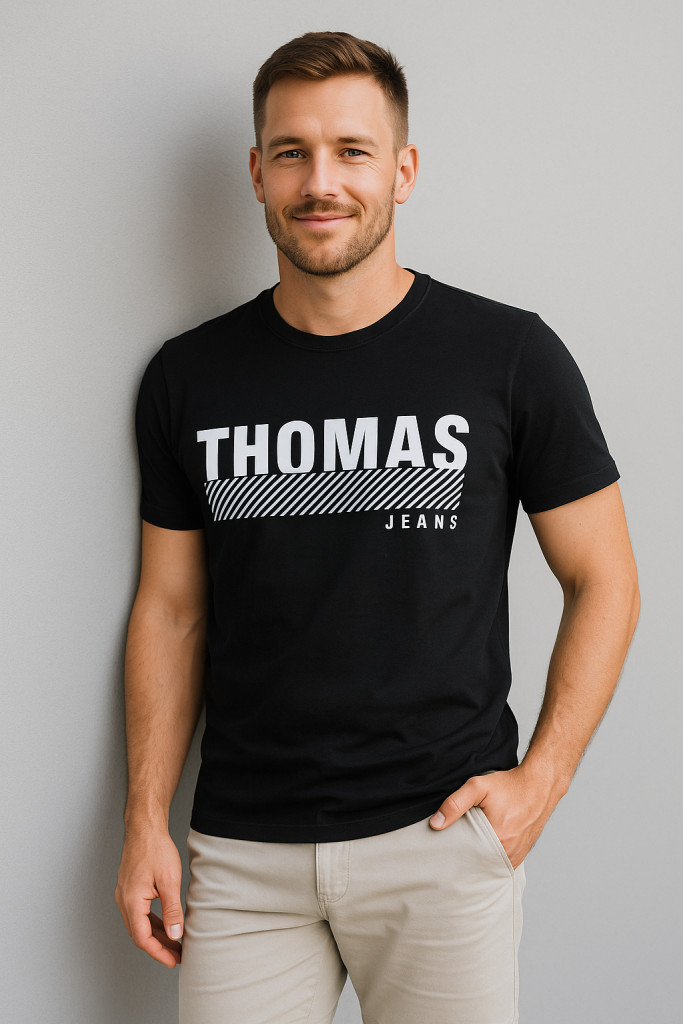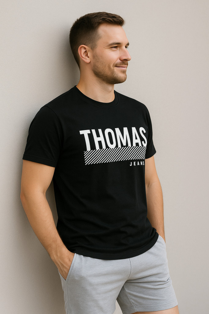 A Thomas Jeans fekete logós férfi póló tökéletes választás azoknak, akik szeretik az egyszerű, mégis karakteres stílust. A fekete alapszín elegáns és könnyen kombinálható, míg a mellkason elhelyezett THOMAS JEANS felirat és a ferde vonalú design modern, dinamikus megjelenést kölcsönöz.