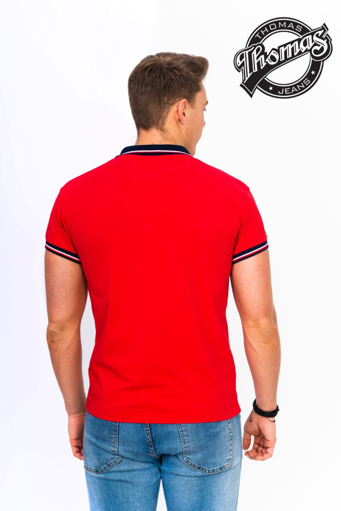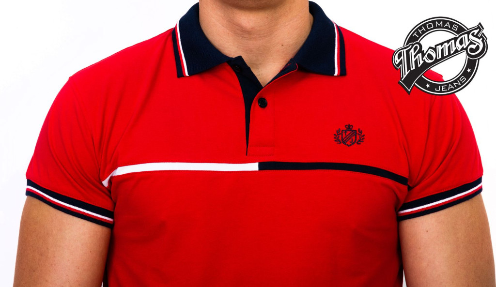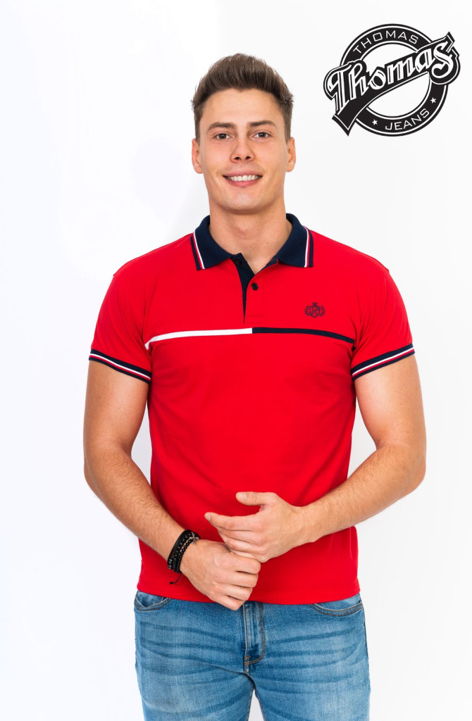 A kétgombos záródású gallér letisztult, elegáns hatást kelt, míg a sötétkék gallér és ujjszegély fehér kontrasztcsíkkal sportosan kiemeli a piros alapszínt. A mellrészt átszelő vékony fehér és sötétkék vízszintes csík modern, fiatalos megjelenést biztosít. A Thomas Jeans logóhímzés a mellkason diszkréten utal a márka prémium minőségére.