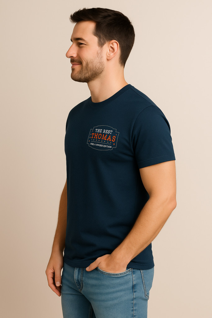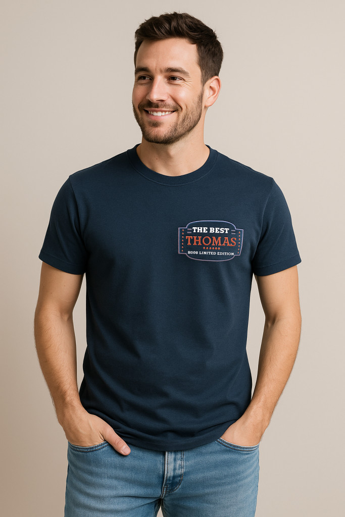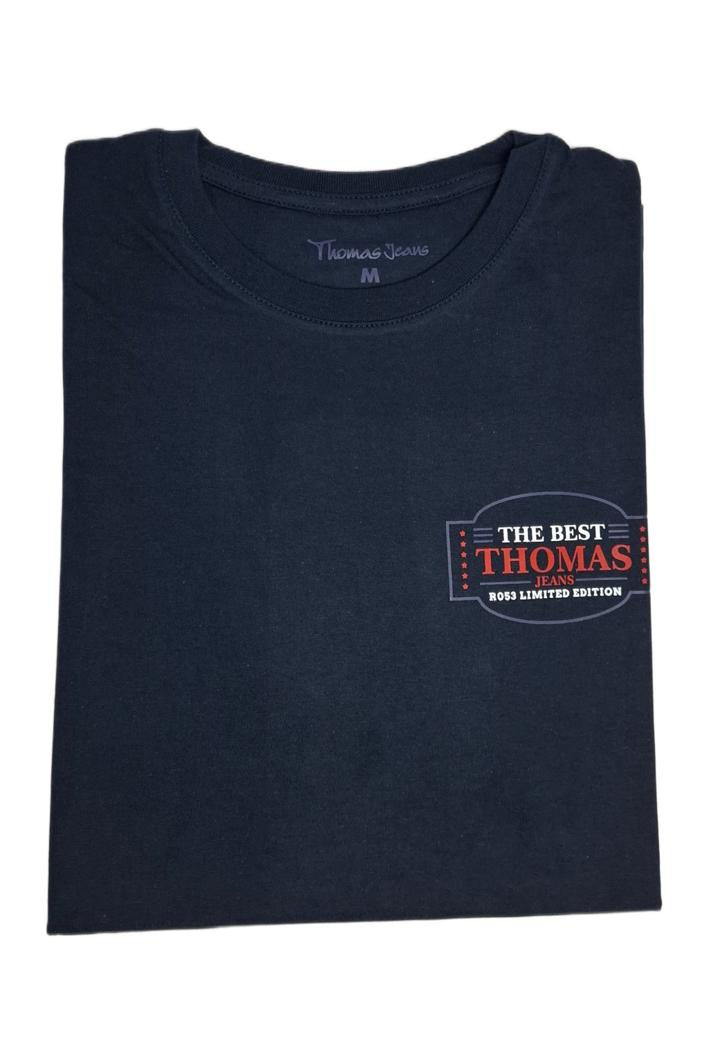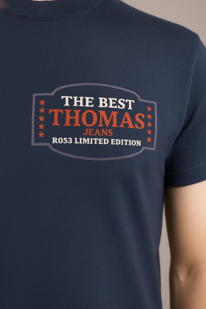 A Thomas Jeans sötétkék „The Best” férfi póló a modern férfi gardrób alapdarabja. A mellkas bal oldalán található „THE BEST – THOMAS JEANS – R053 LIMITED EDITION” logó elegánsan hangsúlyozza a márka prémium megjelenését, miközben visszafogottan sportos stílust kölcsönöz.