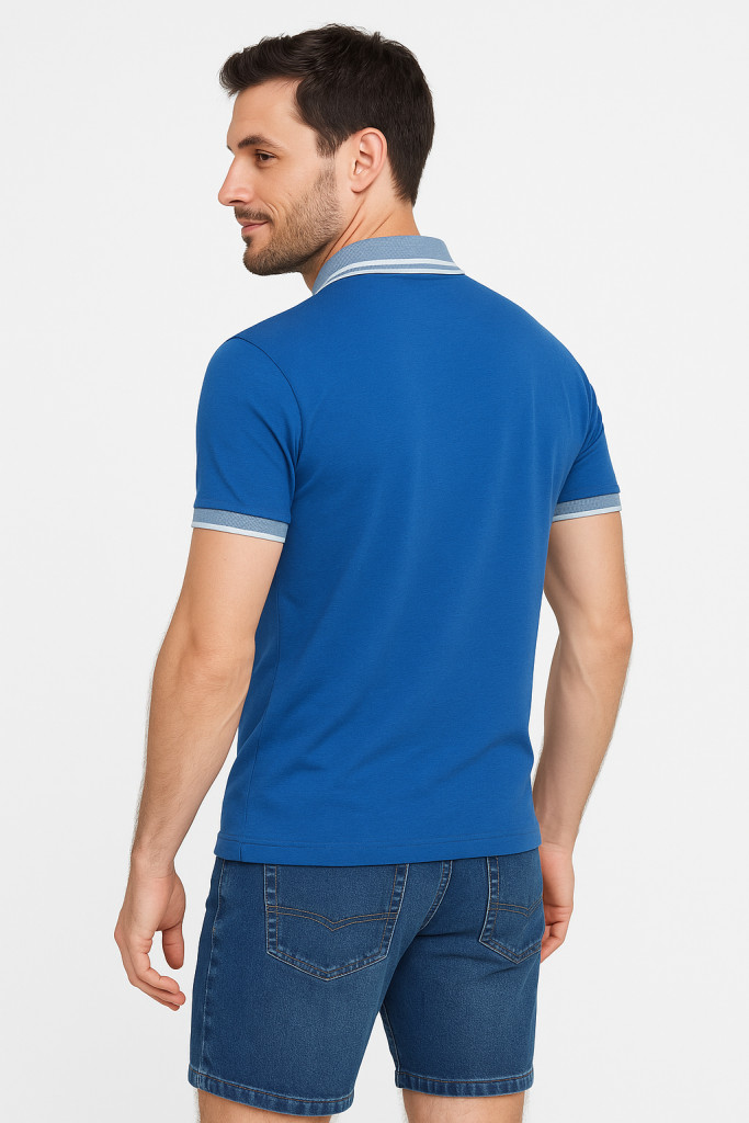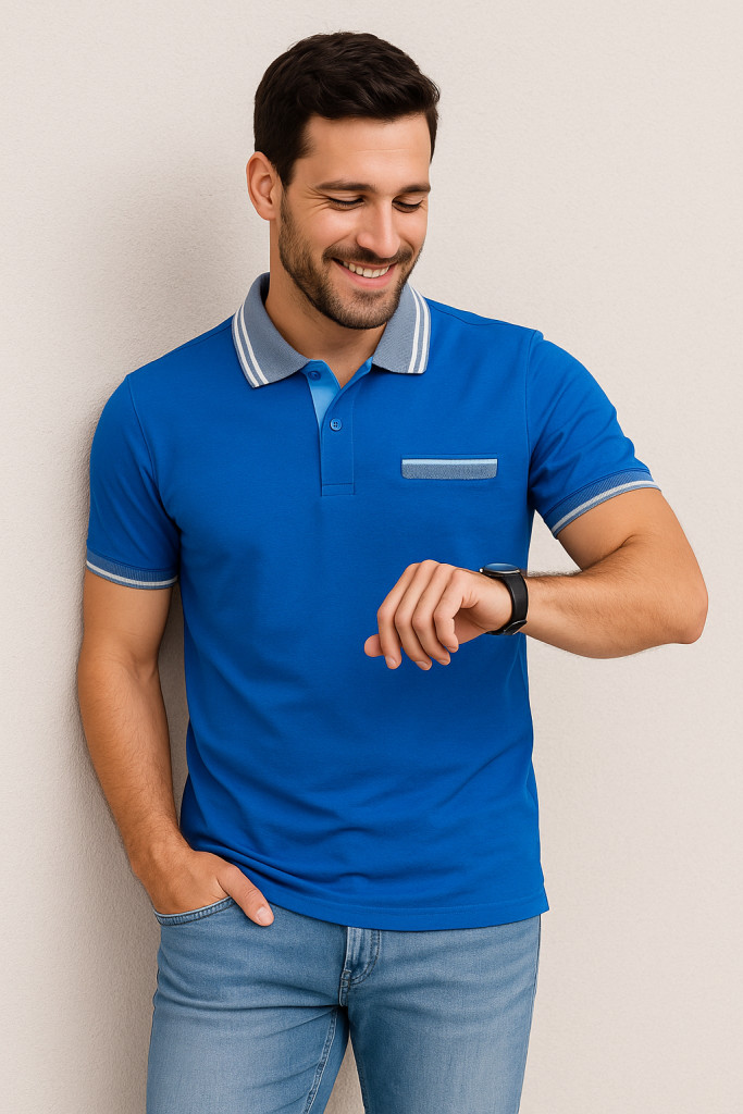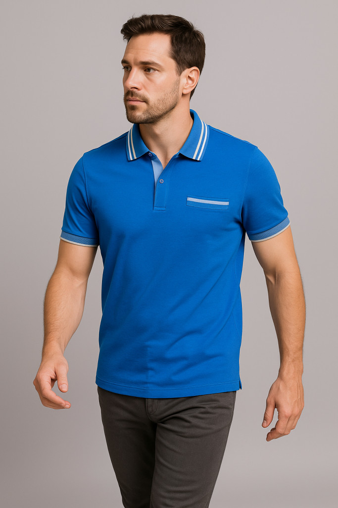 A póló élénk kék alapszíne fiatalos és energikus megjelenést kölcsönöz, amit a világosszürke gallér és ujjvég elegánsan egészít ki. A valódi mellzseb nemcsak dekoratív elem, hanem praktikus funkcióval is bír, így kisebb tárgyak – például jegyek vagy napszemüveg – tárolására is alkalmas.