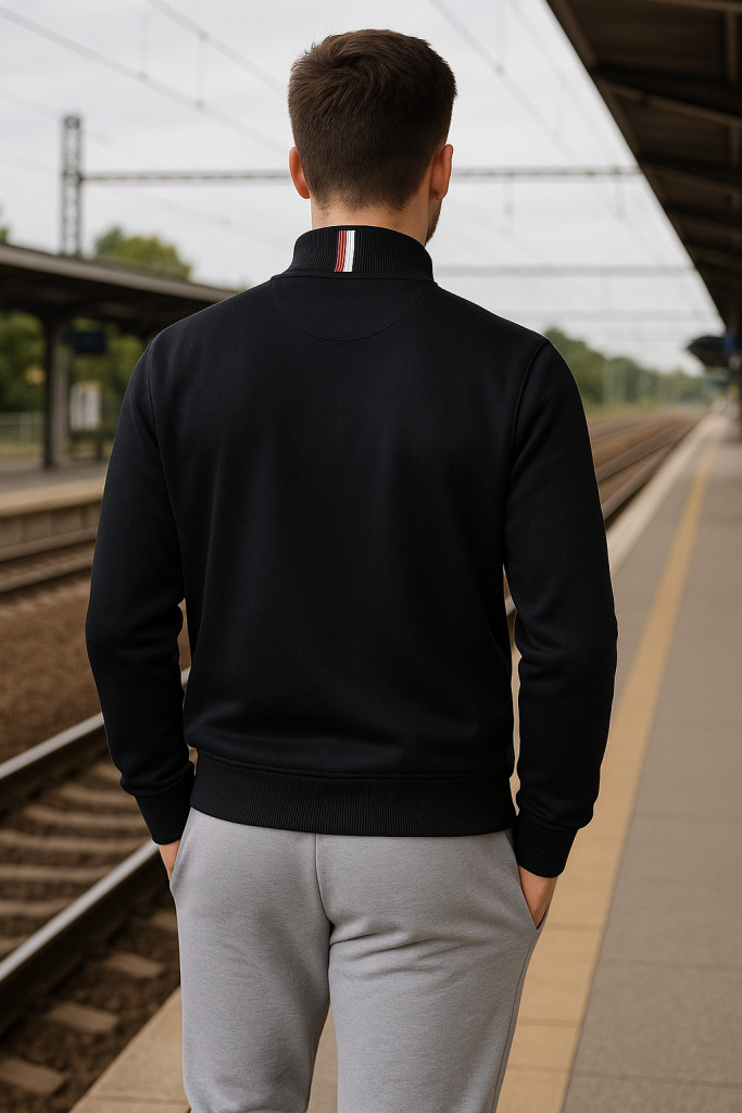 A zipzáros záródás praktikus és modern, a bordázott passzé a galléron, derékrészen és ujjak végén pedig biztosítja a tökéletes illeszkedést. A mellrész diszkrét Thomas Jeans logóval díszített, ami a márka minőségi stílusát képviseli.