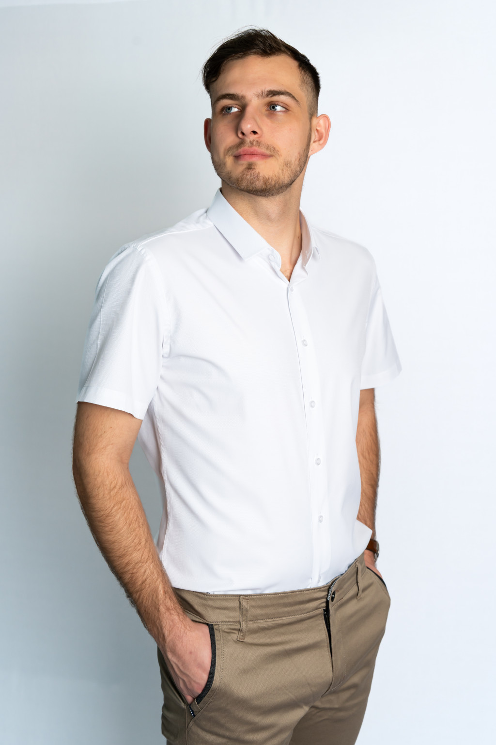 Ez a fehér slim fit férfi rövid ujjú ing a klasszikus elegancia és a modern kényelem tökéletes kombinációja. A letisztult fehér szín és a finom, anyagba nyomott minta egyedi, mégis visszafogott megjelenést biztosít, amely ideális választás üzleti és alkalmi viselethez egyaránt.