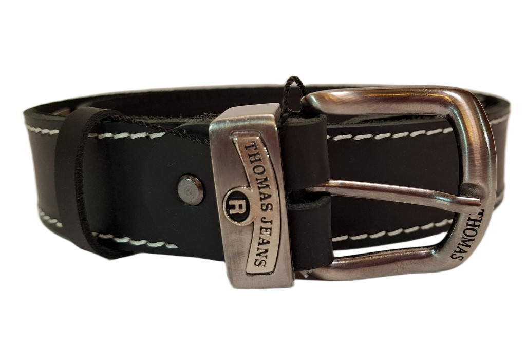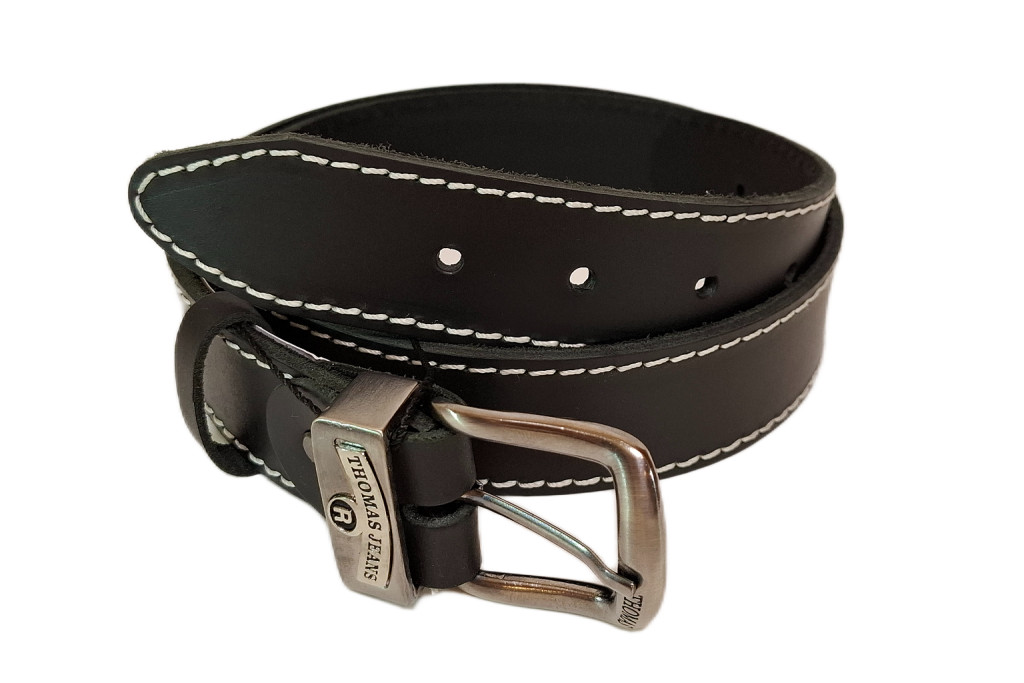 A minőségi bőr öv sima felületű, precíz fehér varrással díszített, amely elegáns kontrasztot alkot a fekete bőrrel. A Thomas Jeans logóval gravírozott, masszív fém csat nemcsak esztétikus, hanem rendkívül strapabíró, hosszú távon is megbízható használatot garantál.