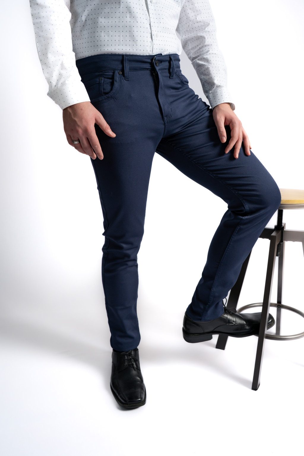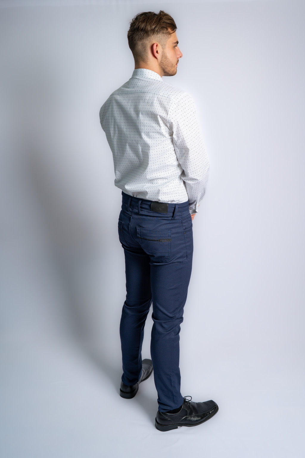 A sötétkék szín rendkívül sokoldalú: kiválóan kombinálható inggel, zakóval, elegáns cipővel, de akár smart casual szettekhez is tökéletes választás.