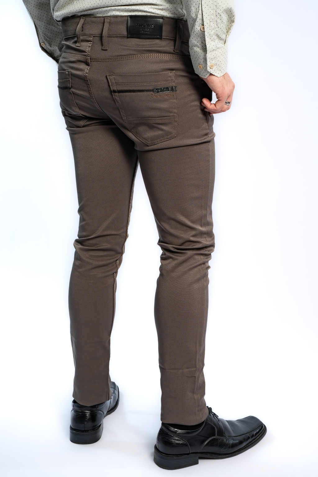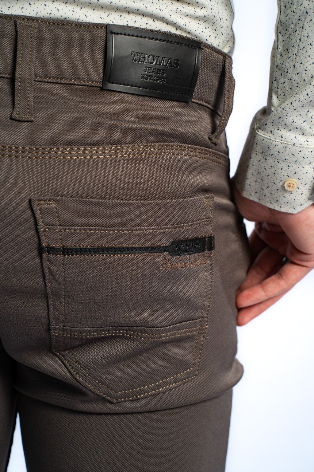 A Thomas Jeans férfi nadrág igényes kidolgozású varrásokkal, minőségi gombokkal és diszkrét márkajelzéssel készült. A klasszikus öt zsebes kialakítás praktikus használatot biztosít, a divatos barna szín pedig könnyen kombinálható bármilyen ruhadarabbal.