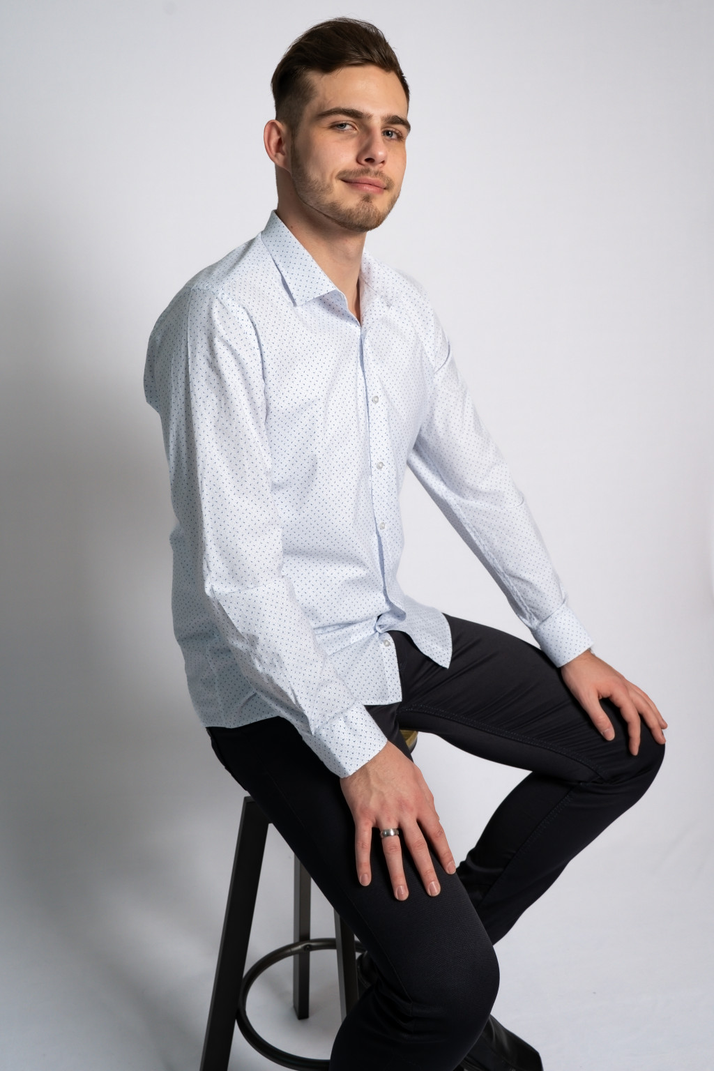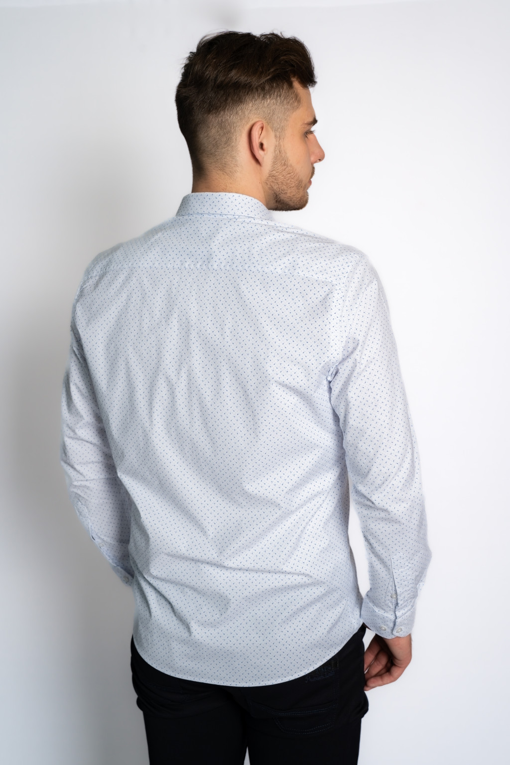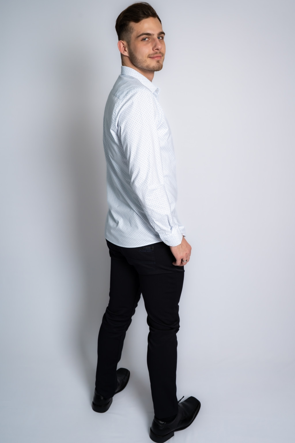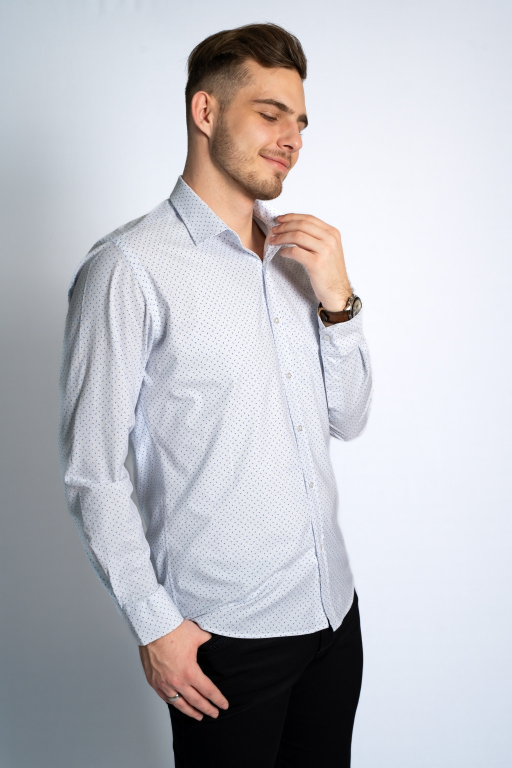 A slim fit szabású férfi ing finoman követi a test vonalát, így viselőjének modern, magabiztos megjelenést kölcsönöz. A letisztult gallérmegoldás, az igényes gombolás és az apró mintázat teszi igazán sokoldalúan kombinálható divatinggé. Viselhető öltönnyel, zakóval, de farmerrel párosítva is tökéletesen megállja a helyét.