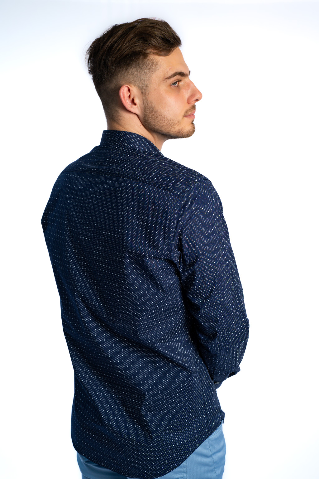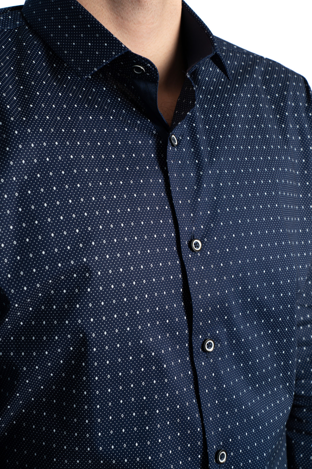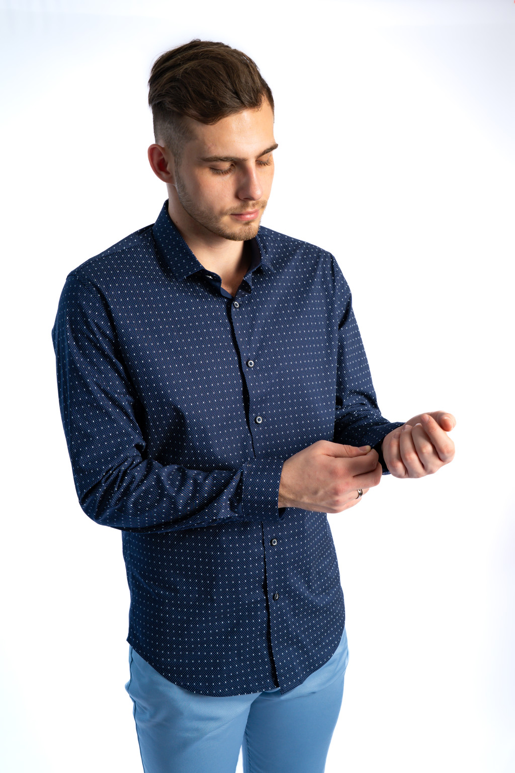 Ez a sötétkék elegáns férfi ing könnyedén beilleszthető a modern férfi ruhatárba: