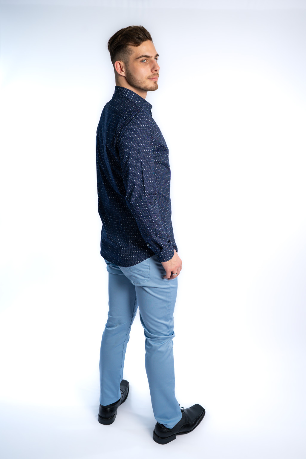 A slim fit szabású férfi ing tökéletes választás azoknak, akik a letisztult, fiatalos stílust kedvelik. Nem túl szűk, mégis határozottan karcsúsított vonalvezetésű, amely ideális zakó alá, elegáns nadrághoz vagy akár farmerhez is. A finom, apró mintázat eleganciát kölcsönöz, így az ing alkalmas üzleti tárgyalásra, randevúra, ünnepi eseményre vagy hétköznapi viseletre egyaránt.