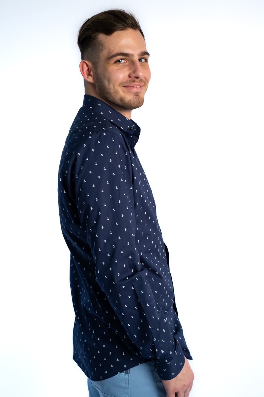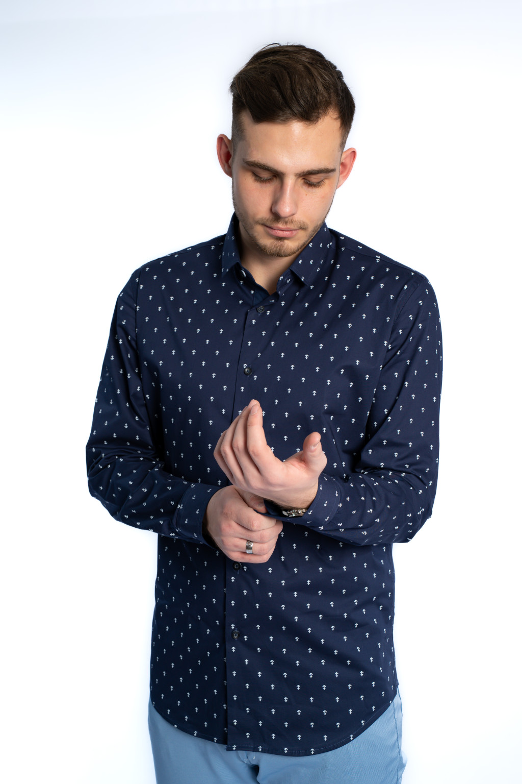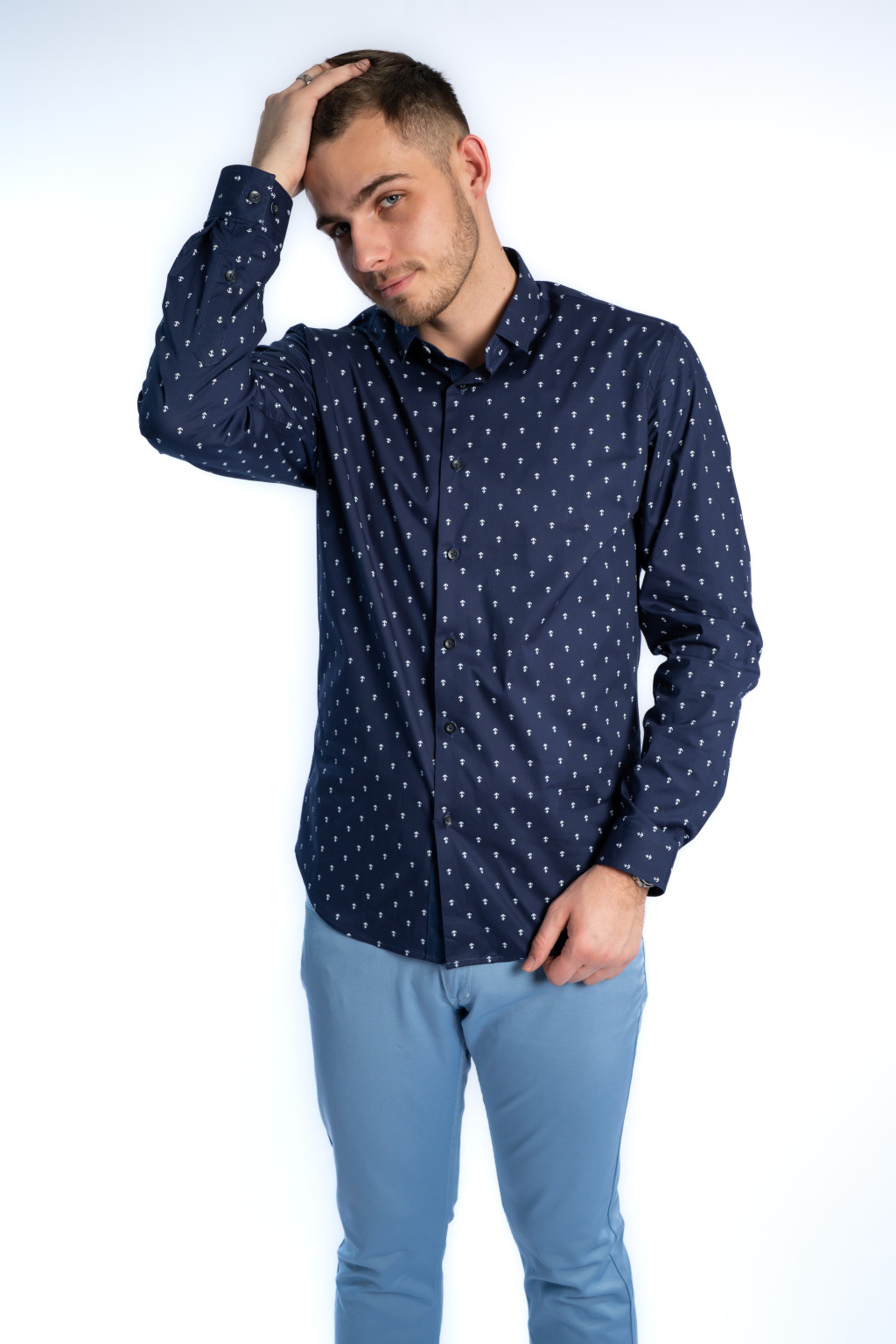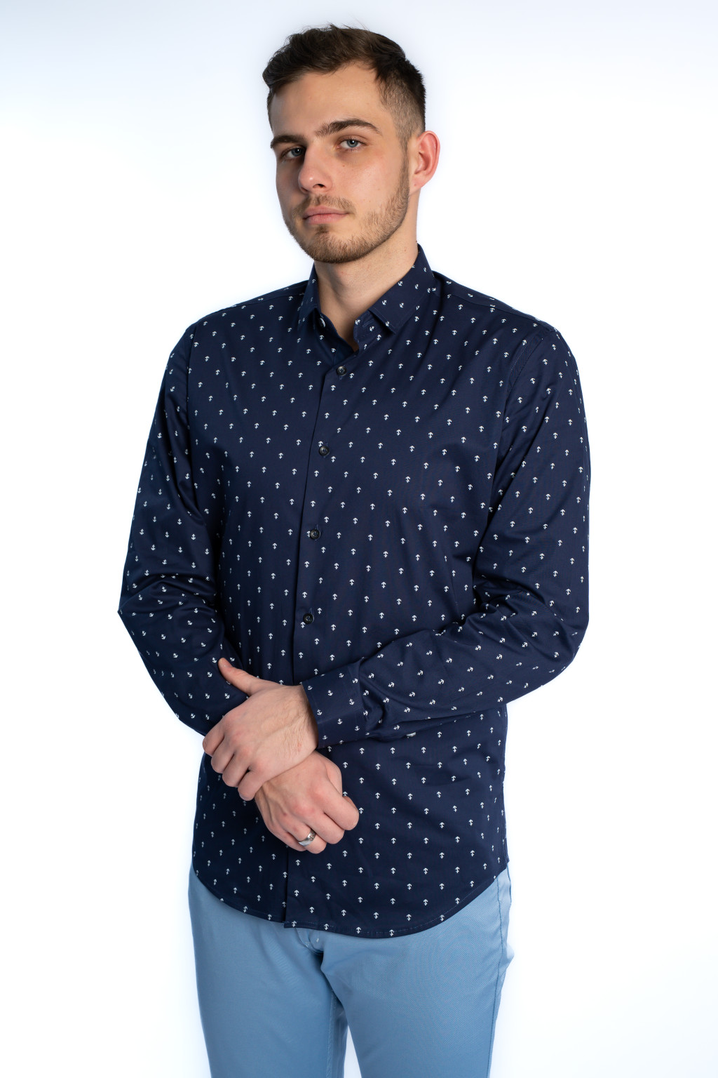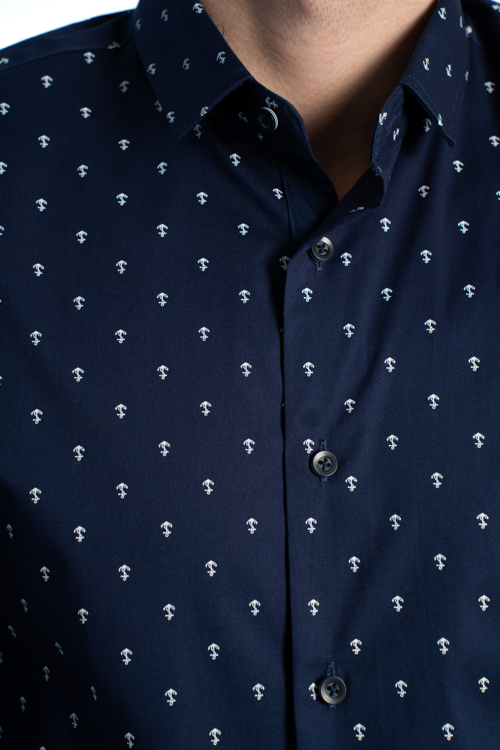 A divatos, apró horgony mintás dizájn teszi ezt a modellt igazán különlegessé. A sötétkék férfi ing könnyedén kombinálható chino nadrággal, farmerrel vagy elegáns szövetszövettel is, ezért tökéletes eleme a smart casual férfi ruhatárnak. Viselheted zakó alatt, de önmagában is kifinomult megjelenést biztosít.