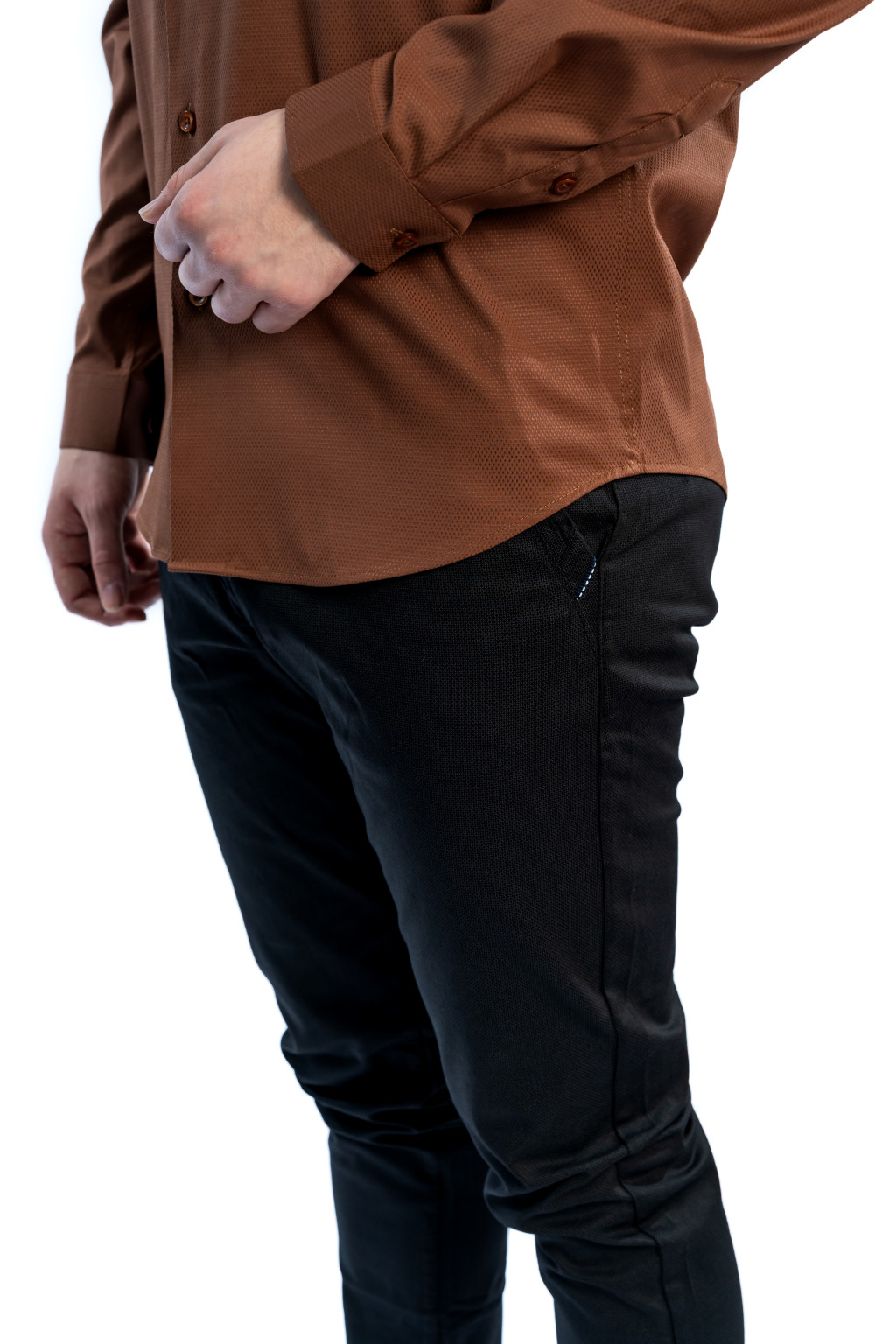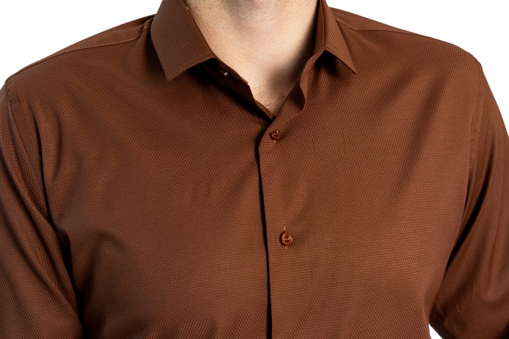 A finoman kidolgozott magában mintás férfi ing különleges textúrát ad az anyagnak, amely diszkréten jelenik meg, mégis prémium és stílusos megjelenést biztosít. Ez a barna elegáns férfi ing tökéletes azok számára, akik az egyszerű, mégis karakteres darabokat kedvelik.