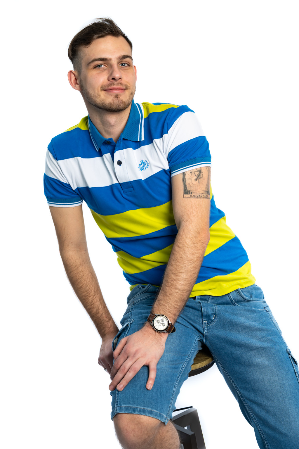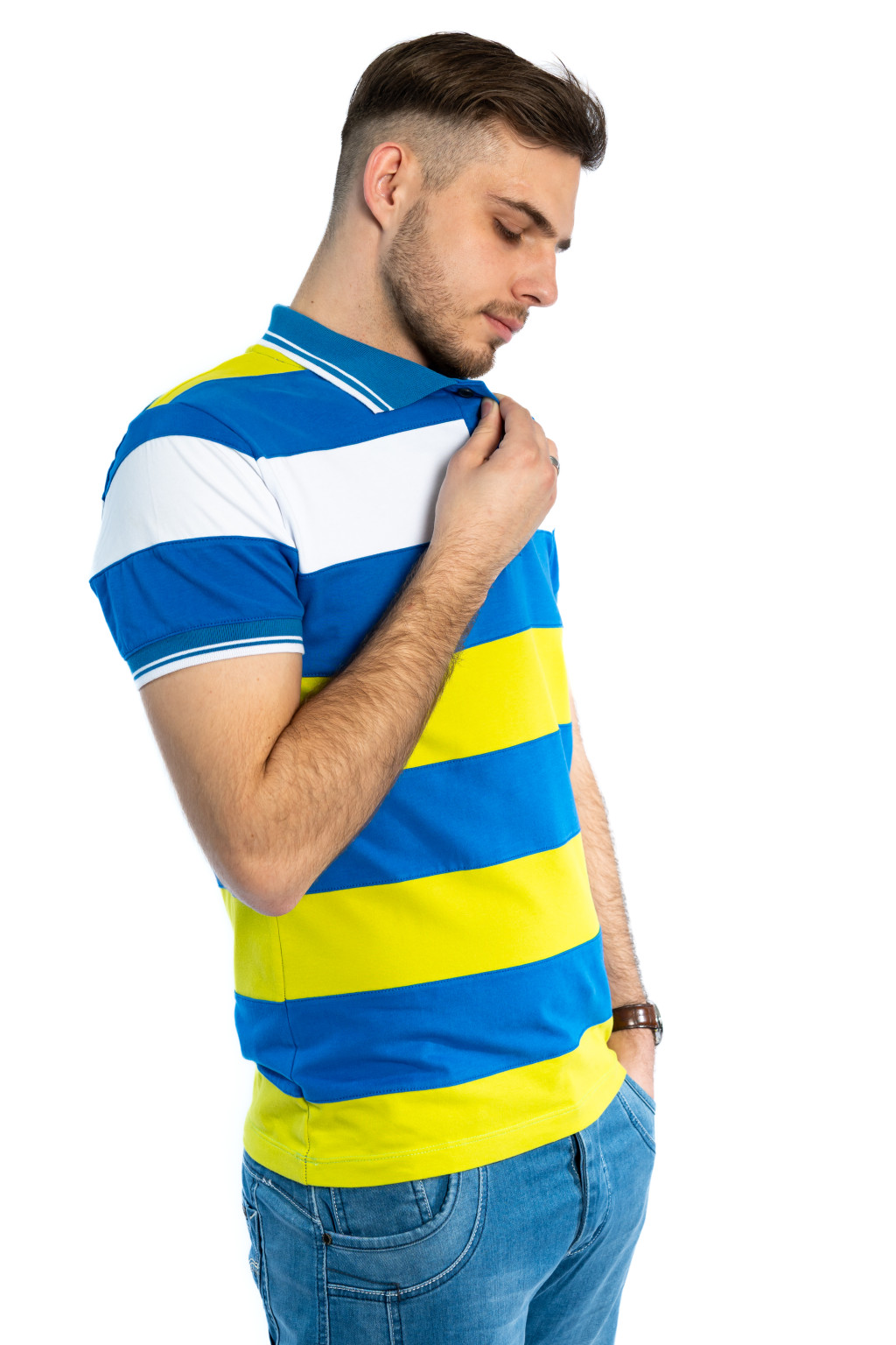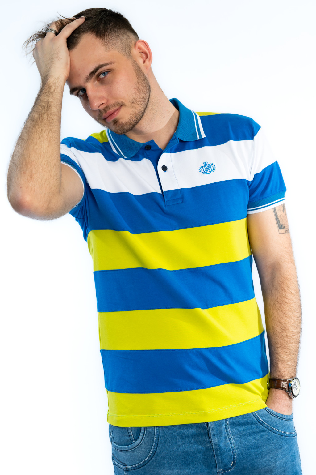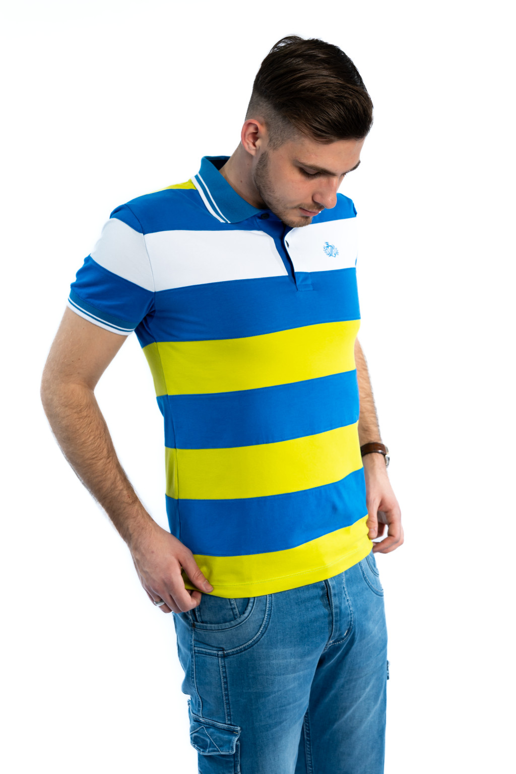 A póló különlegessége a kontrasztos kék, fehér és sárga csíkos mintázat, amely dinamikus és fiatalos megjelenést biztosít. A galléros kialakítás és a gombos nyakrész elegánsabb irányba viszi a stílust, így ez a darab egyszerre sportos és casual elegáns.