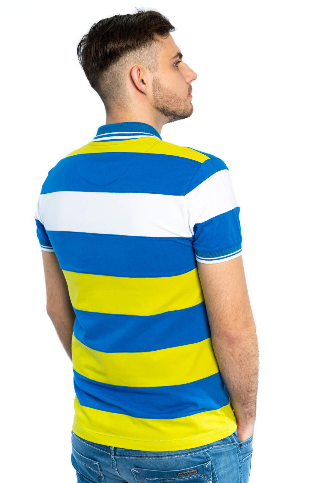 Ez a kék-sárgászöld csíkos férfi galléros póló (polo) tökéletes választás azok számára, akik egy feltűnő, mégis stílusos férfi felsőt keresnek. A széles csíkos dizájn modern, sportos megjelenést kölcsönöz, amely garantáltan kiemel a hétköznapi öltözködésből.