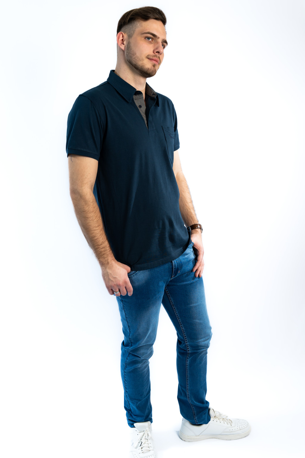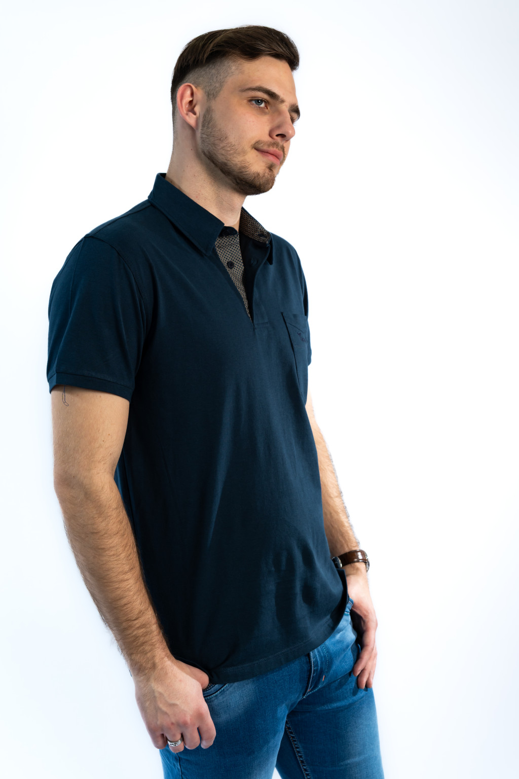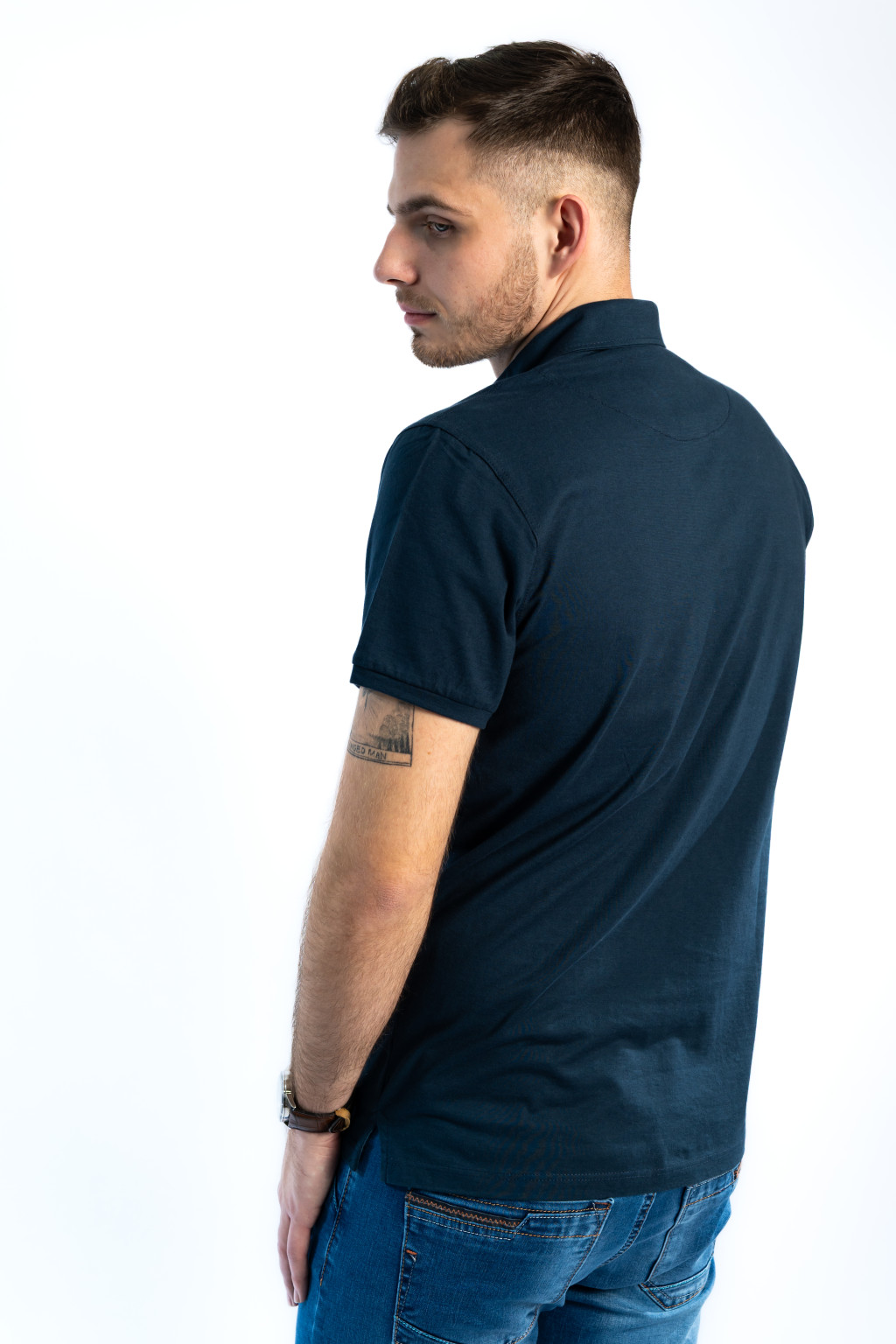 Ez a sötétkék férfi galléros póló (polo) egy letisztult, mégis részletgazdag darab, amely tökéletes választás a mindennapi elegáns, mégis kényelmes viselethez.