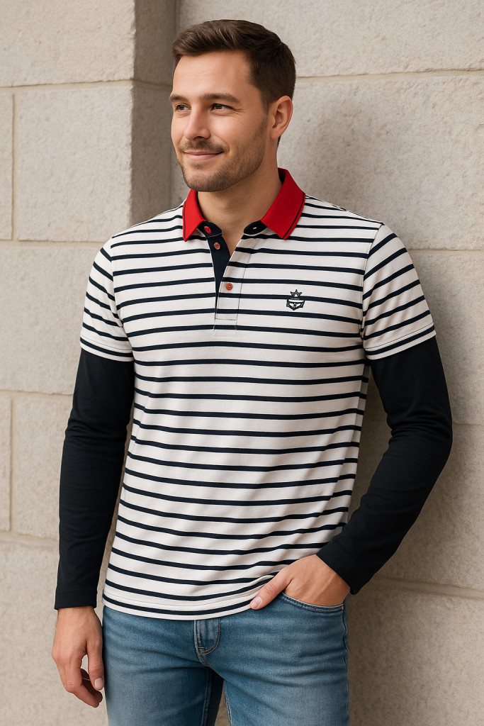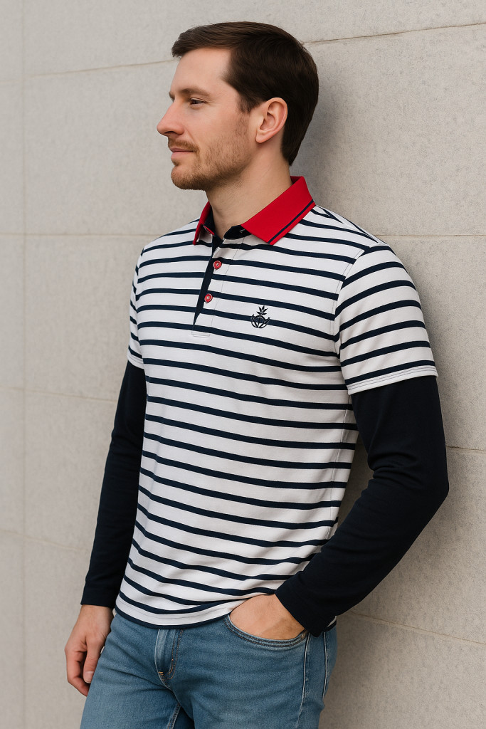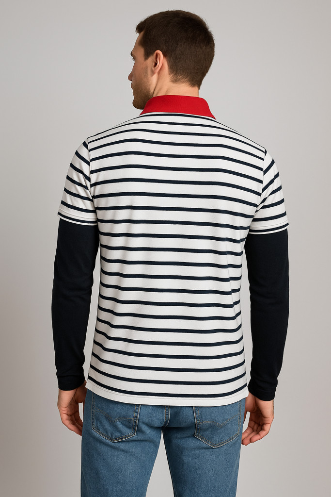 Ez a különleges darab 100% pamutból készült, ami kivételes légáteresztést, puhaságot és tartósságot garantál. A fekete-fehér vízszintes csíkozás időtlen stílust sugároz, míg a piros gallér és a fekete gombolópanel feltűnő, mégis ízléses kontrasztot teremt – egyértelműen a Thomas Jeans prémium vonalának védjegye.