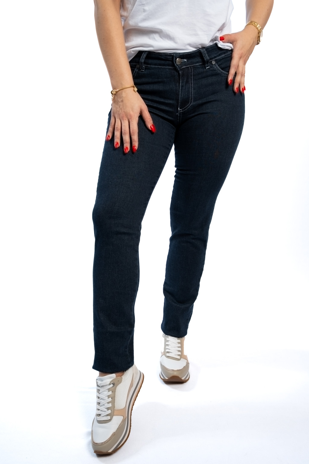 Ez a sötétkék női farmernadrág a klasszikus elegancia és a modern kényelem tökéletes kombinációja. Az időtálló egyenes szárú női farmer fazon optikailag nyújtja az alakot, miközben kényelmes és szabad mozgást biztosít a mindennapok során.