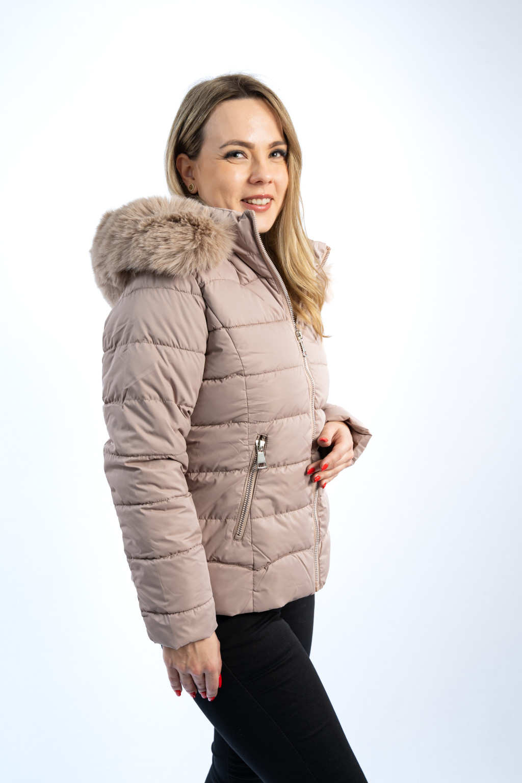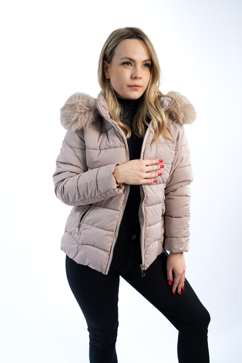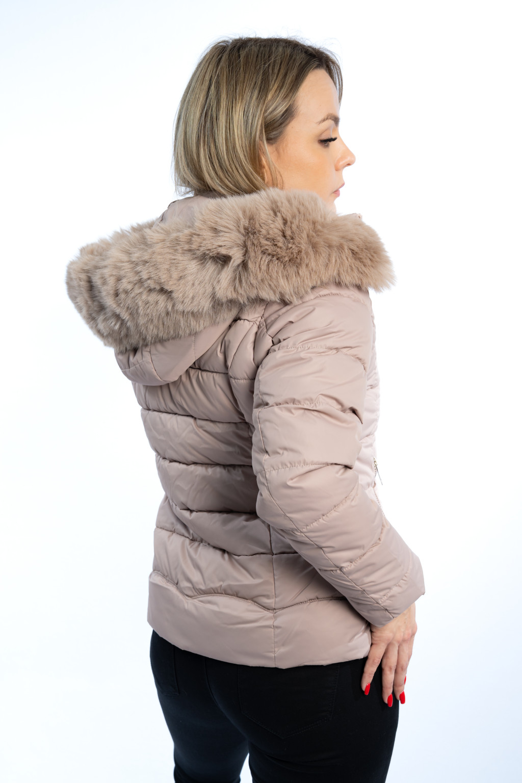 Ez a világos bézs női téli dzseki a stílus és funkcionalitás tökéletes kombinációja. A modern, karcsúsított fazonú női kabát szépen követi az alakot, miközben maximális komfortot biztosít a hideg időszakban.