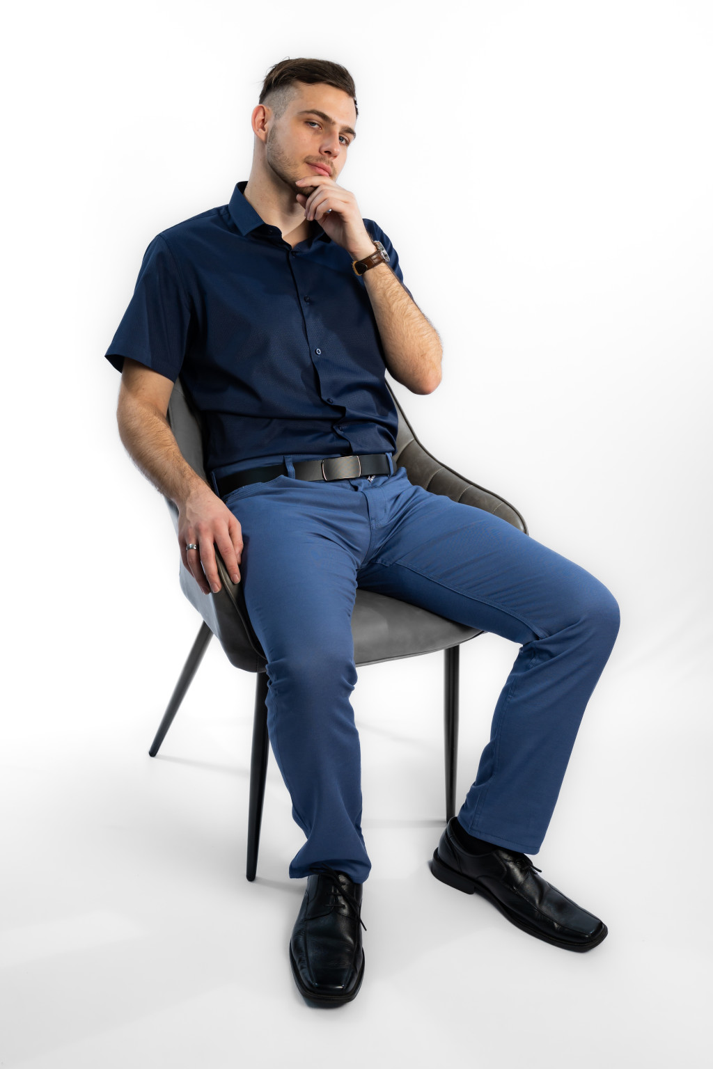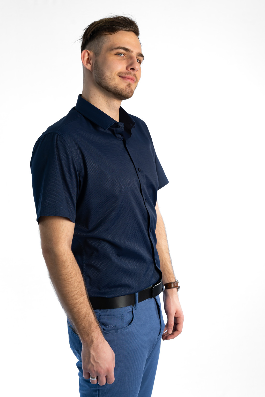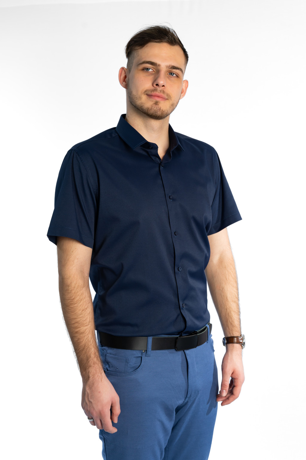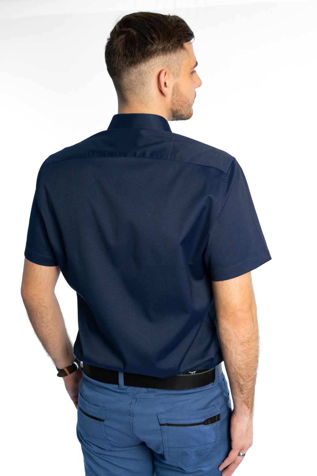 Ez a sötétkék rövid ujjú slim fit férfi ing tökéletes választás azok számára, akik a modern elegancia és a kényelmes viselet kombinációját keresik. A karcsúsított (slim fit) szabás kiemeli a test vonalát, így az ing stílusos, férfias megjelenést biztosít mindennapi és alkalmi viselet során is.