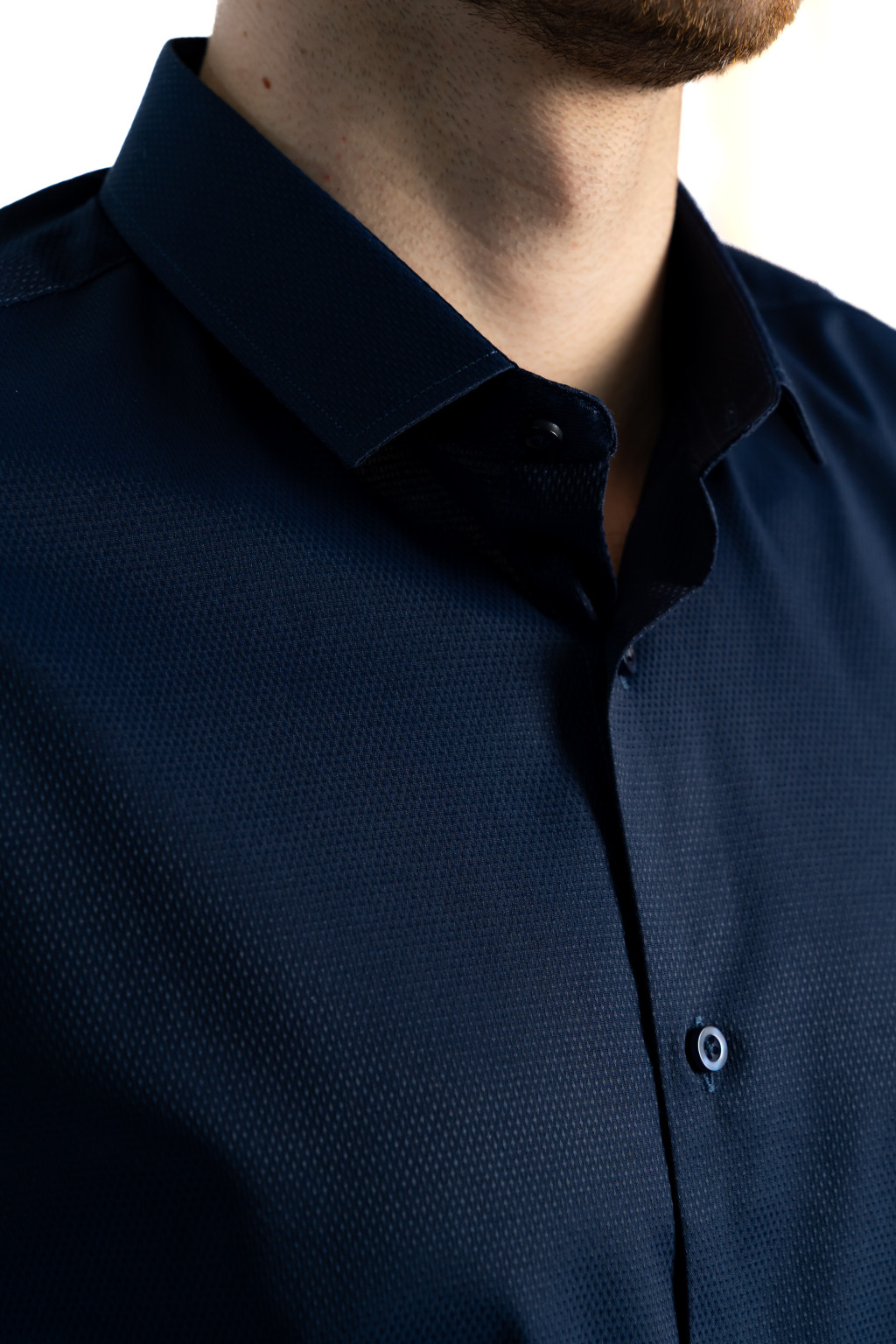 A különleges megjelenést az anyagába finoman nyomott mintás felület adja, amely diszkrét, mégis prémium hatású textúrát biztosít. Ez a részlet teszi igazán egyedivé ezt a sötétkék férfi inget, miközben megőrzi az elegáns, letisztult stílust.