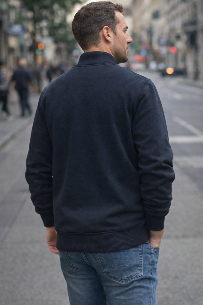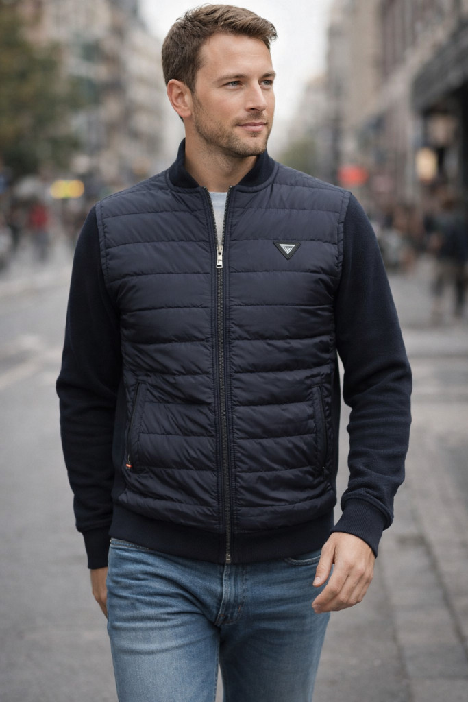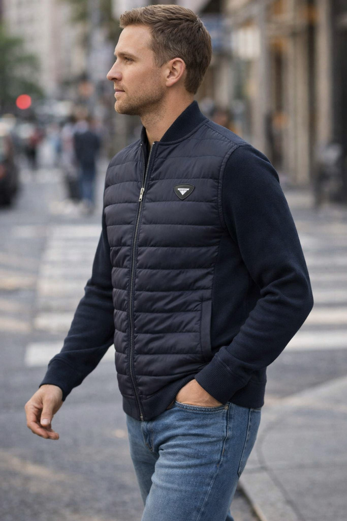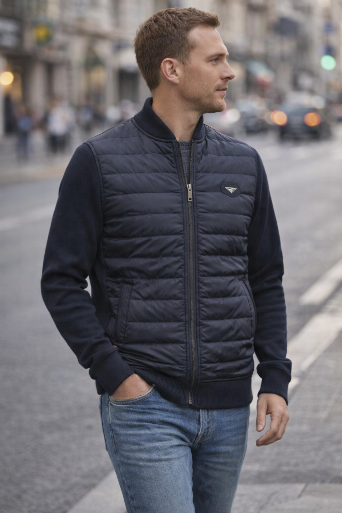 Ez az éjkék férfi kardigán elől steppelt kialakítással ideális választás, ha egy sportosan elegáns, mégis praktikus felsőruházatot keresel. A letisztult design és a modern szabás tökéletesen illeszkedik a mai férfi divathoz.