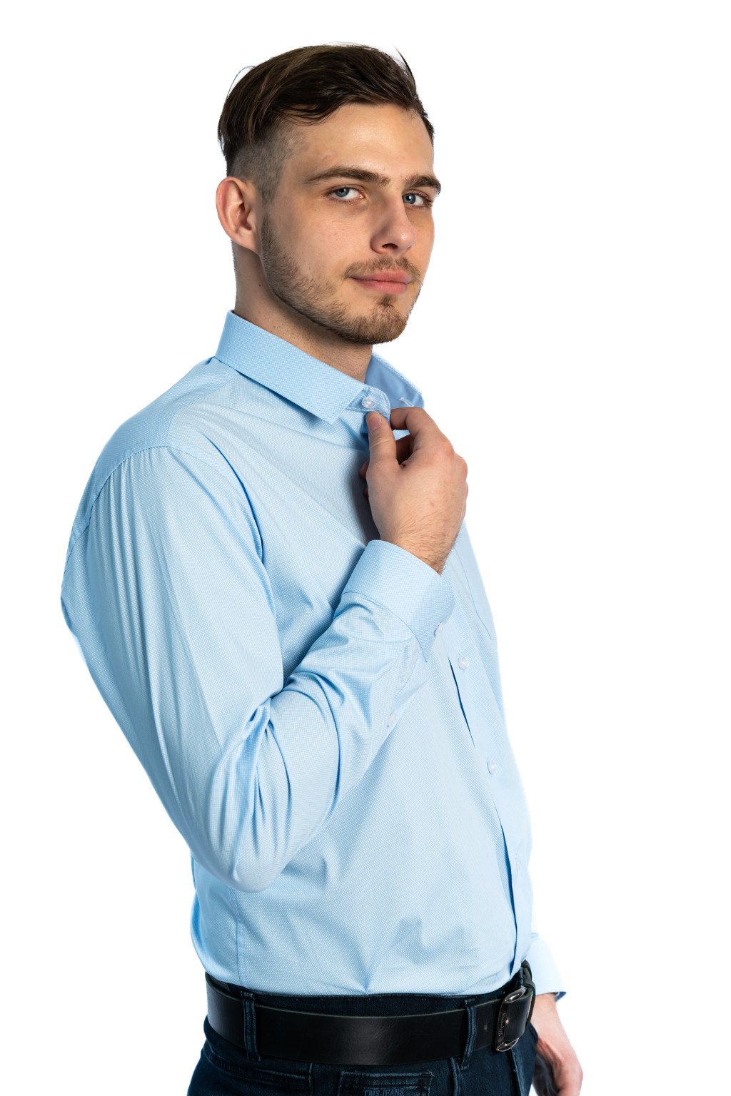 Ez a világoskék hosszú ujjú férfi ing ideális választás azok számára, akik egy klasszikus, mégis modern megjelenésű inget keresnek. A finoman texturált, magában mintás anyag elegáns részletet ad, amely diszkréten emeli ki a darab prémium jellegét.