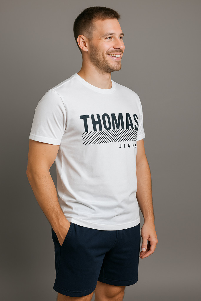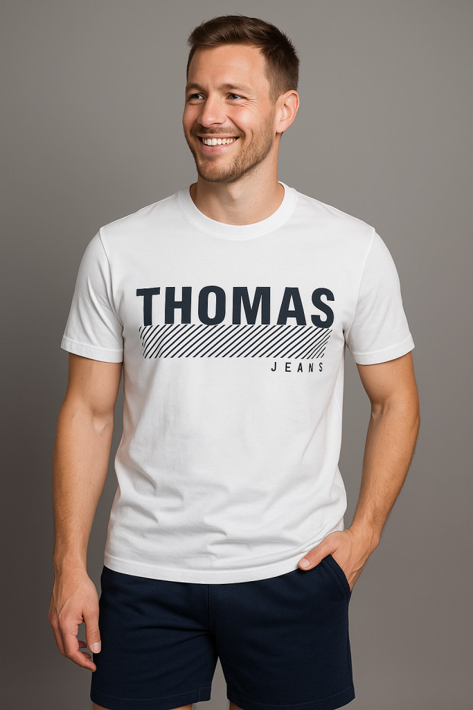 A Thomas Jeans fehér logós férfi póló a minimalista stílus és a prémium kényelem tökéletes kombinációja. A tiszta fehér alapszín elegáns, friss hatást kelt, amit a fekete THOMAS JEANS felirat és a ferde csíkozású grafika tesz modernné és karakteressé.